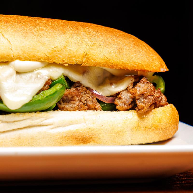 Garlic white sauce, steak, mozzarella cheese, provolone cheese, peppers, and onions.