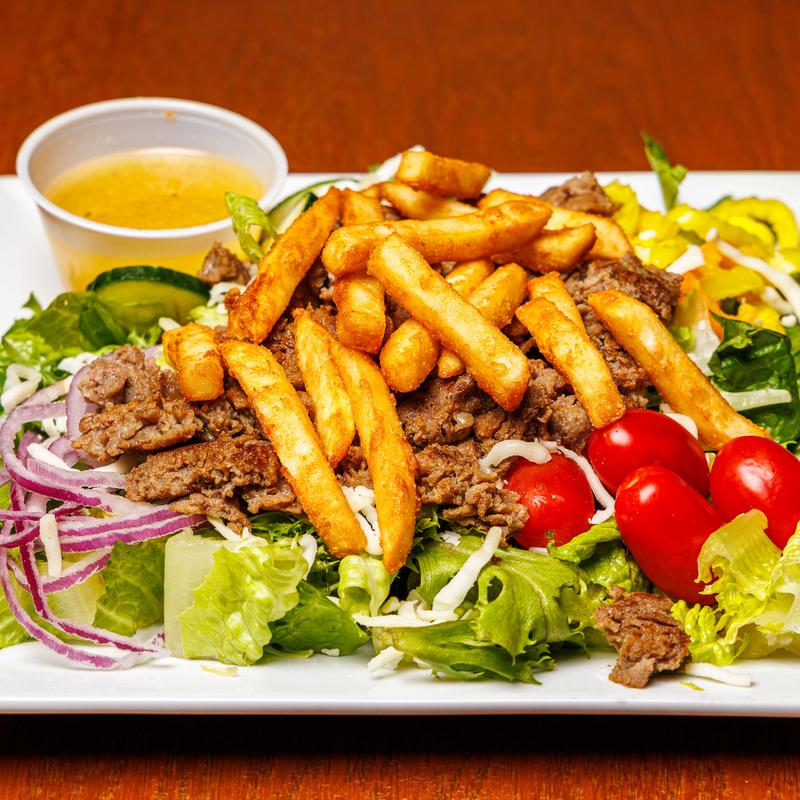 Philly steak, french fries, cucumbers, tomatoes, onions, banana peppers, mozzarella cheese.