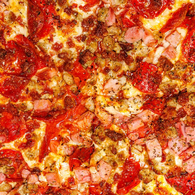 Traditional sauce, ham, pepperoni, sausage, bacon, and mozzarella cheese.